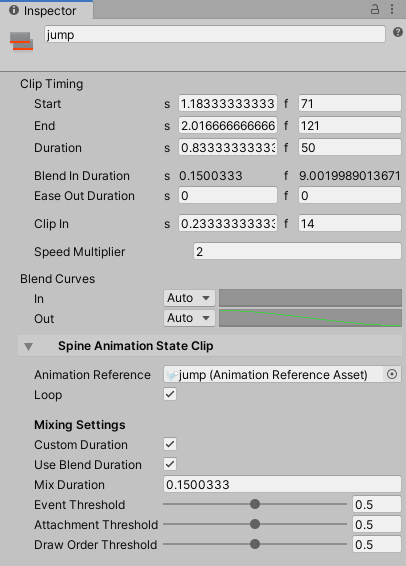 • Edit mode preview mixing may look different from Play Mode mixing. Please check in actual Play Mode to see the actual results. Please see the remark in the Spine AnimationState Track section on correct track ordering when previewing multiple overlaid tracks.