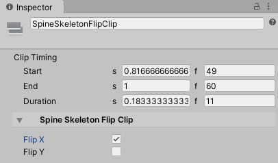 Add Spine Skeleton Flip Clip Clip. - Adjust the start and end times of the new clip, name it appropriately at the top of the Inspector, and choose the desired FlipX and FlipY values.